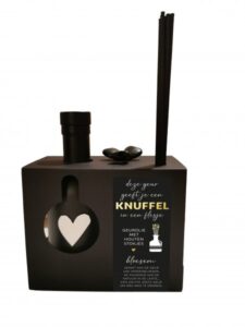 Onze geliefde geuroliecollectie is nu beschikbaar in een stijlvolle zwarte uitvoering. De houten stokjes en hartjes zijn volledig in het zwart uitgevoerd voor een chique en tijdloze uitstraling. Perfect om een ruimte te vullen met een subtiele, heerlijke geur én een mooie wens.